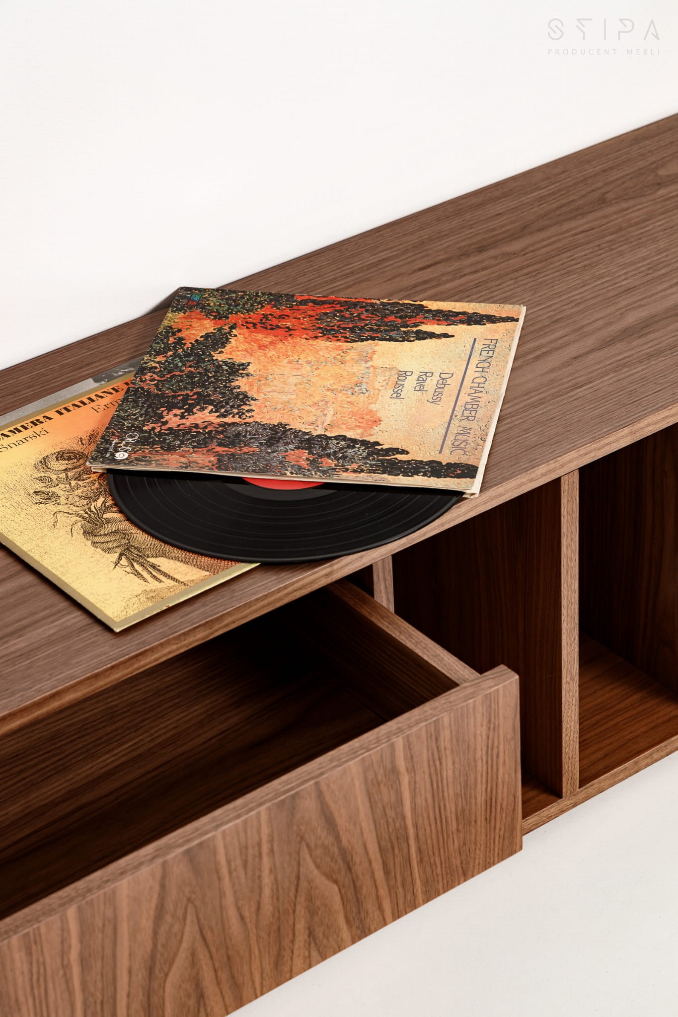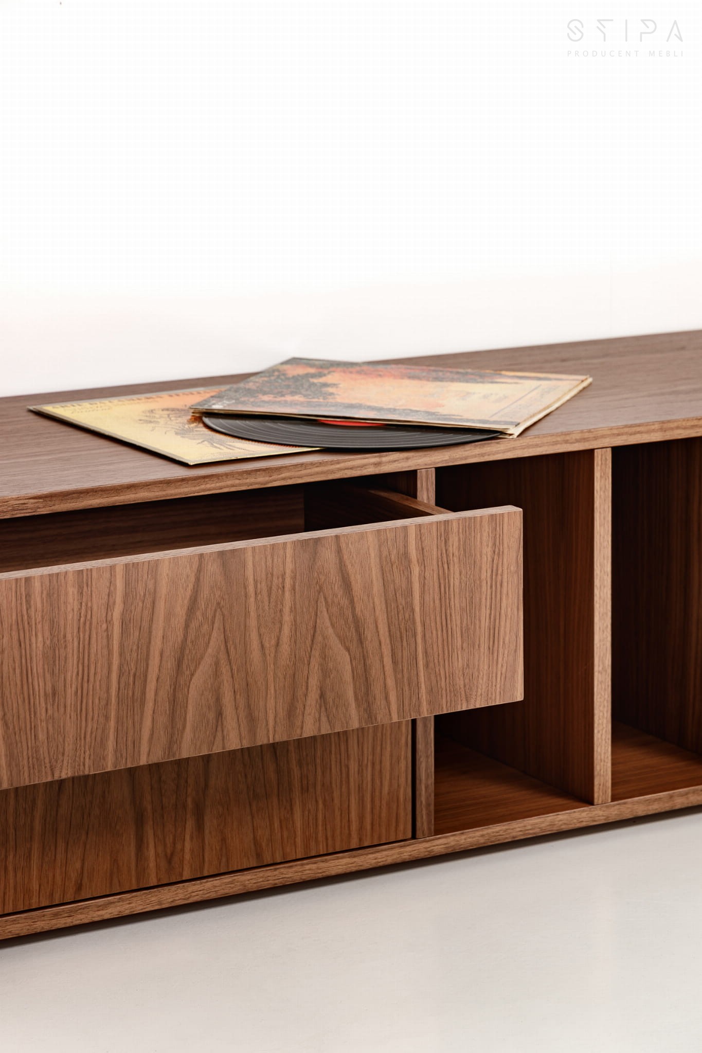 - Zwei Schubladen und Fächer für Schallplatten.
