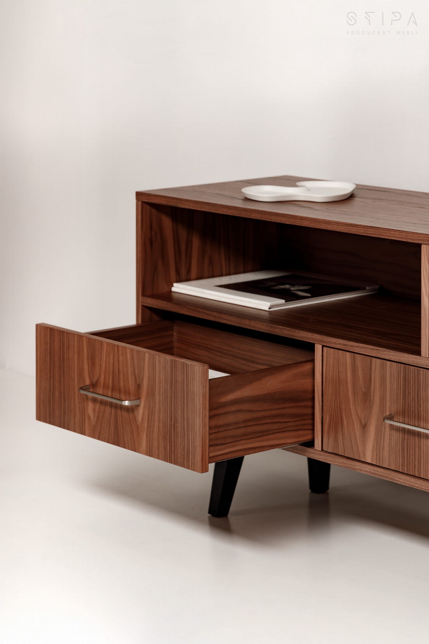 Die Schubladen verfügen über ein Soft-Closing-System. Dadurch ist die Kommode leise und komfortabel zu bedienen. Aufgrund seiner geringen Größe, modernen Schließsysteme und seines Fassungsvermögens wird es zu einem Möbelstück für kleine Räume. Die Kommode aus Walnussholz erdrückt den Raum nicht mit ihrer Größe. Es bietet Platz für viele Dinge, die die Bewohner benötigen. Dank ihm können Sie Kleidung, Spielzeug, elektronisches Zubehör oder Bekleidungszubehör organisieren und verstecken.