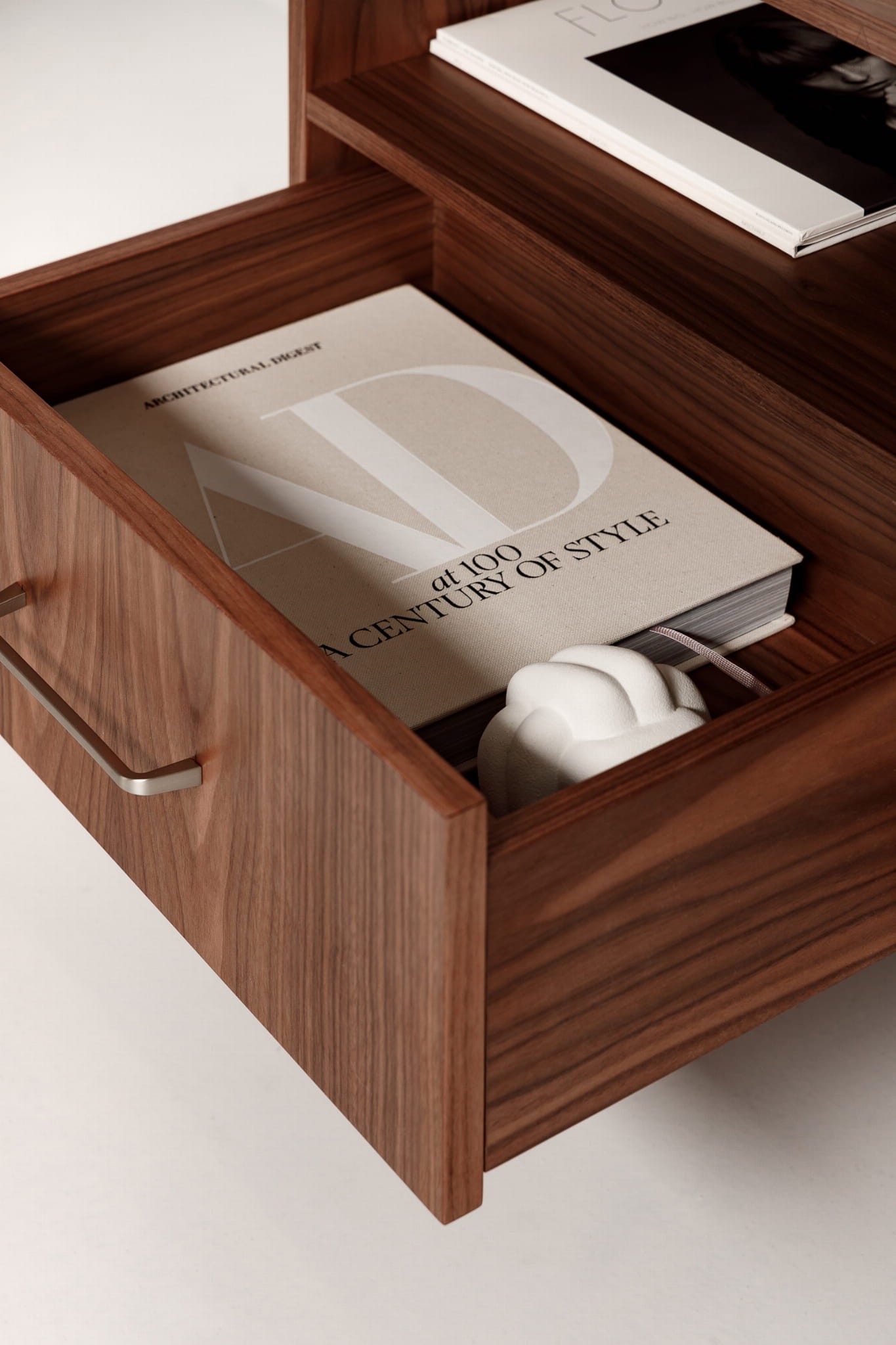 Die Kommode aus Walnussholz verfügt über zwei Einlegeböden und drei Schubladen zur Aufbewahrung von Kleidung und anderen Gegenständen.