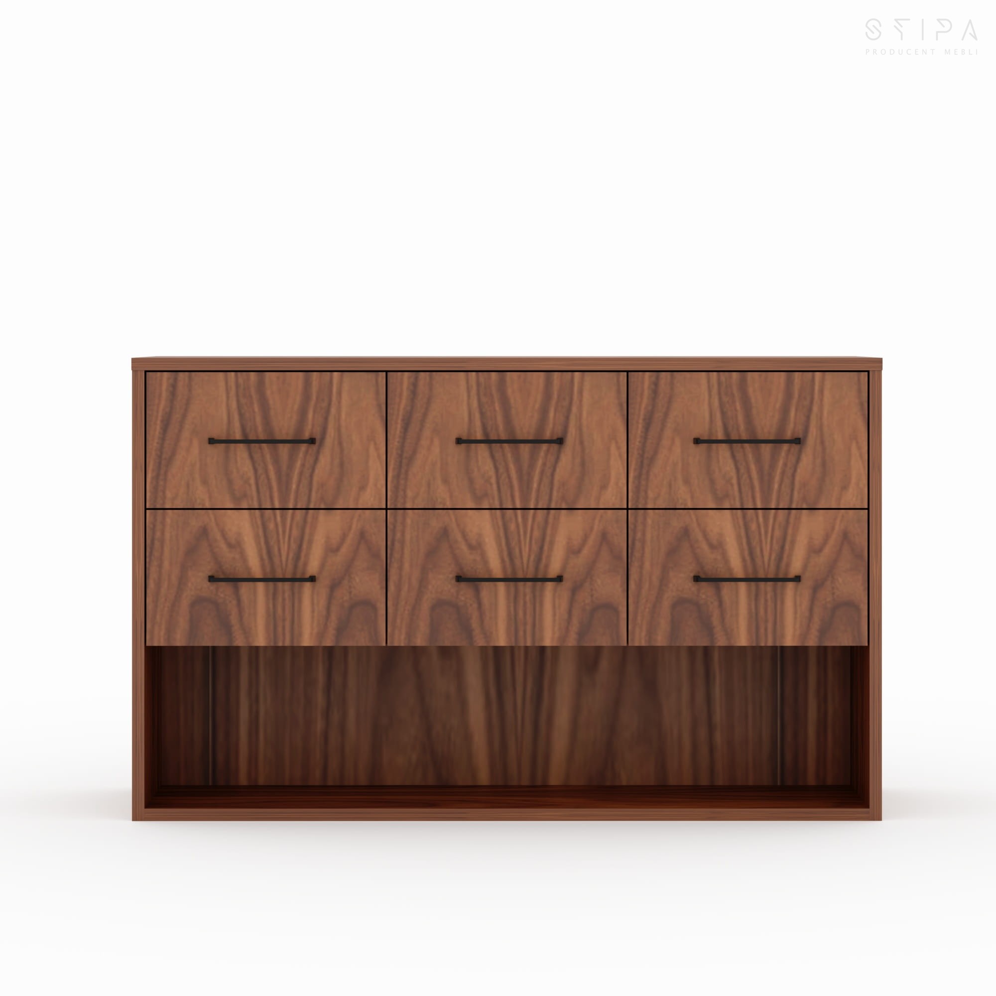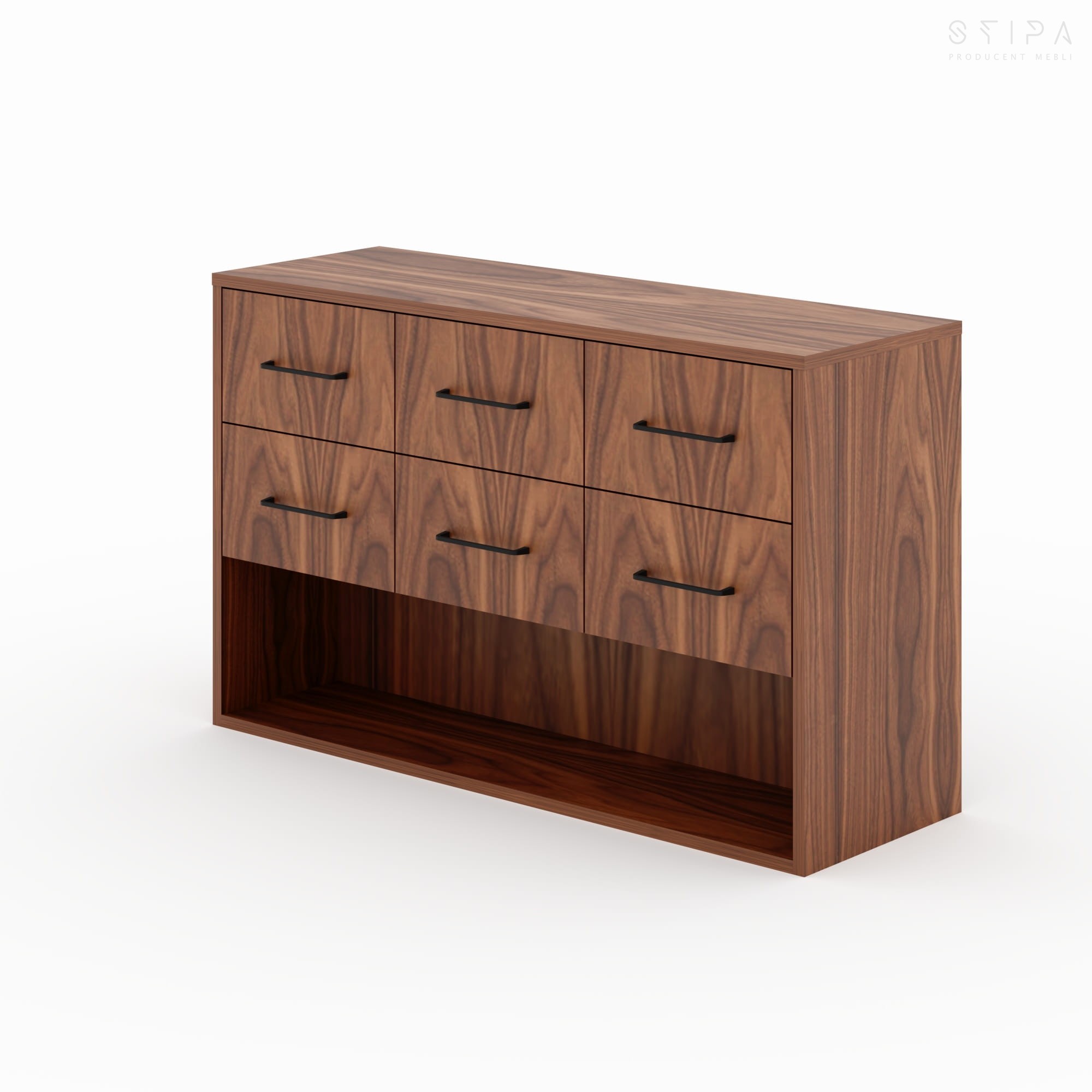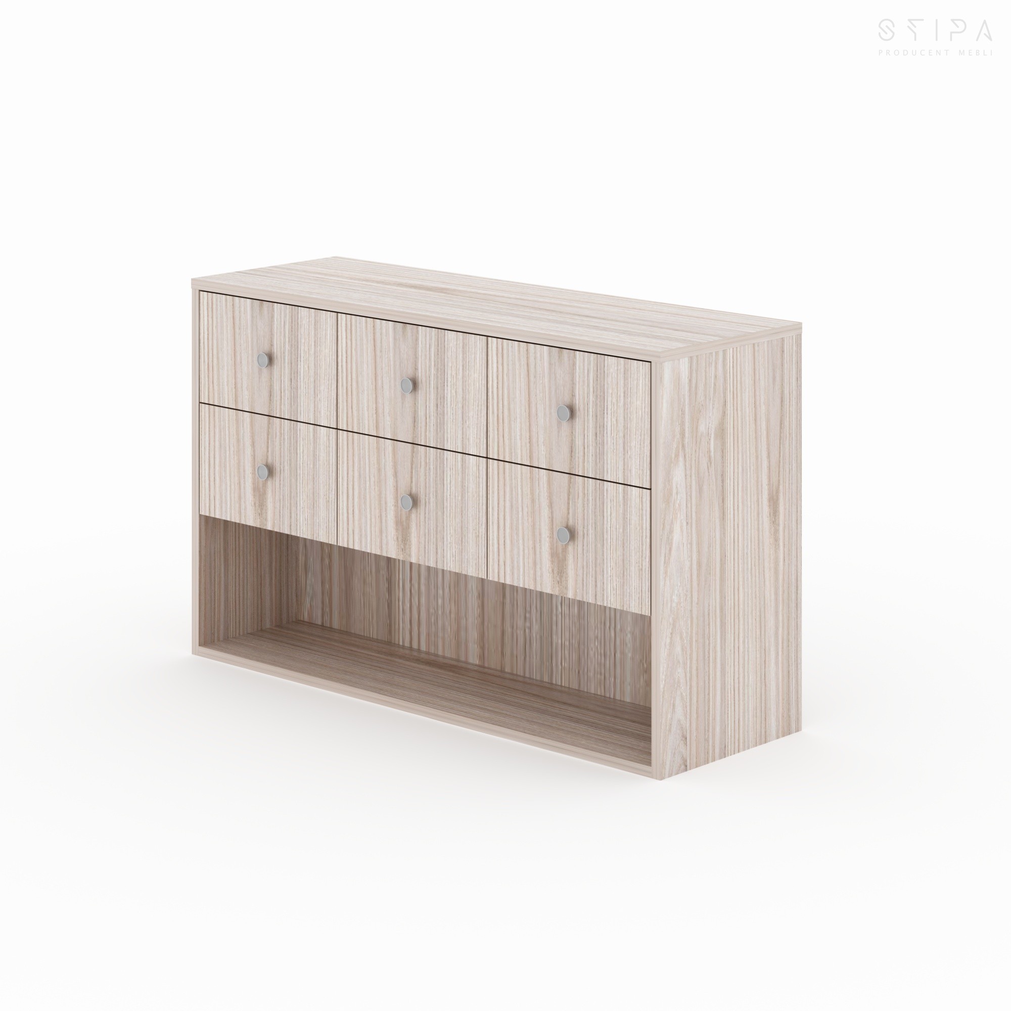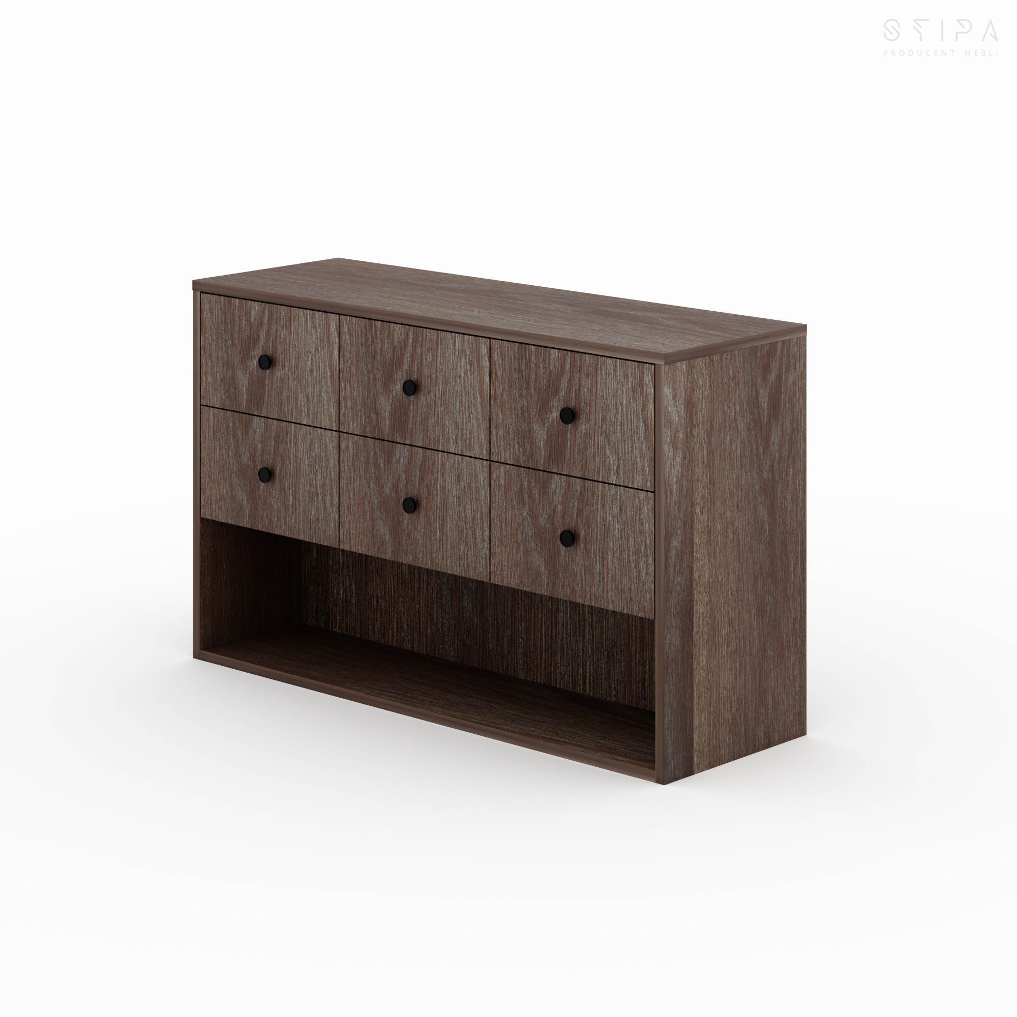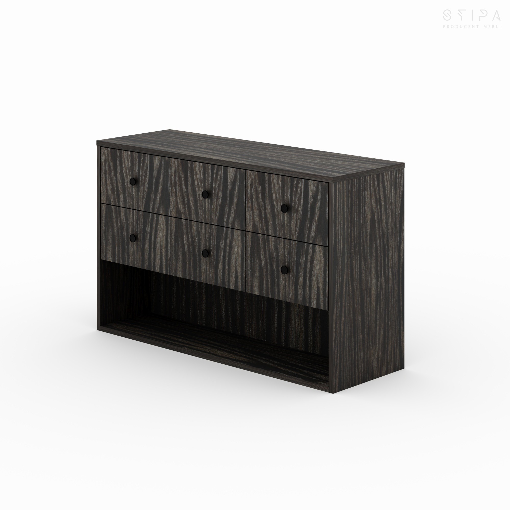FUCHSIA is an elegant chest of drawers with a modern, architectural silhouette that combines minimalist design with everyday functionality. The layout of 6 drawers makes it easy to organize documents, textiles, and accessories, while the open niche at the bottom beautifully displays books, albums, décor, or baskets. Designed for premium interiors, it remains discreet yet distinctive thanks to its generous surfaces and visible wood grain.