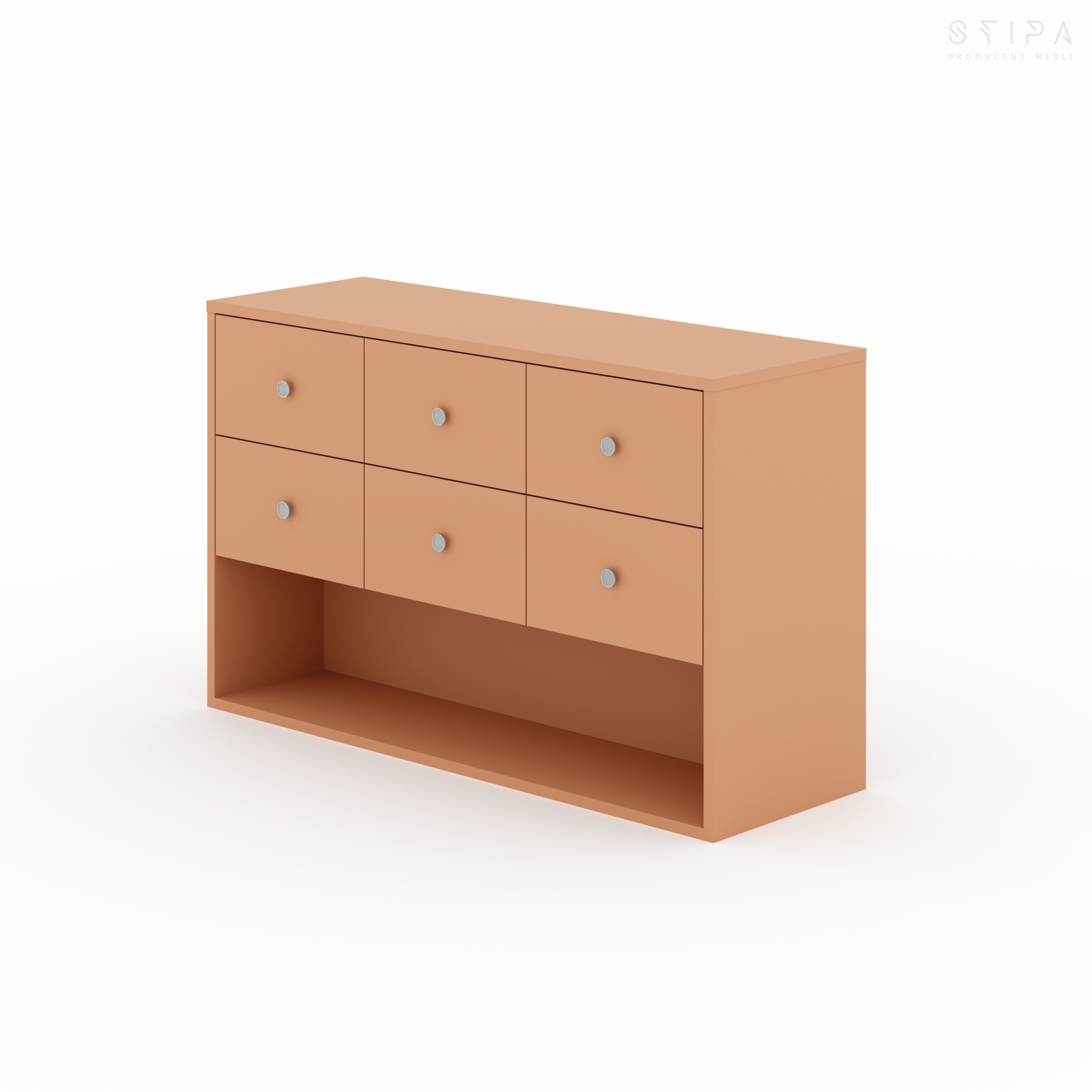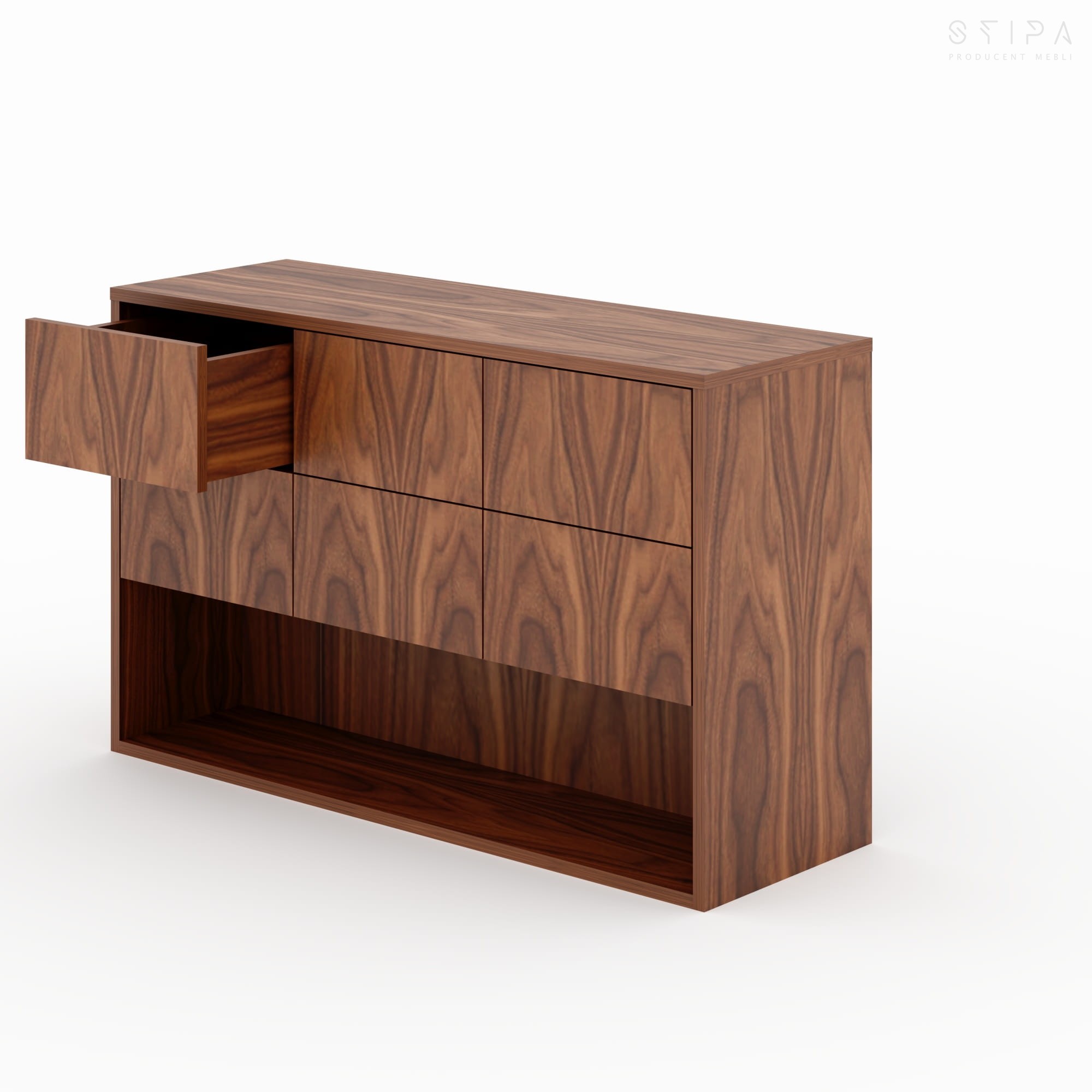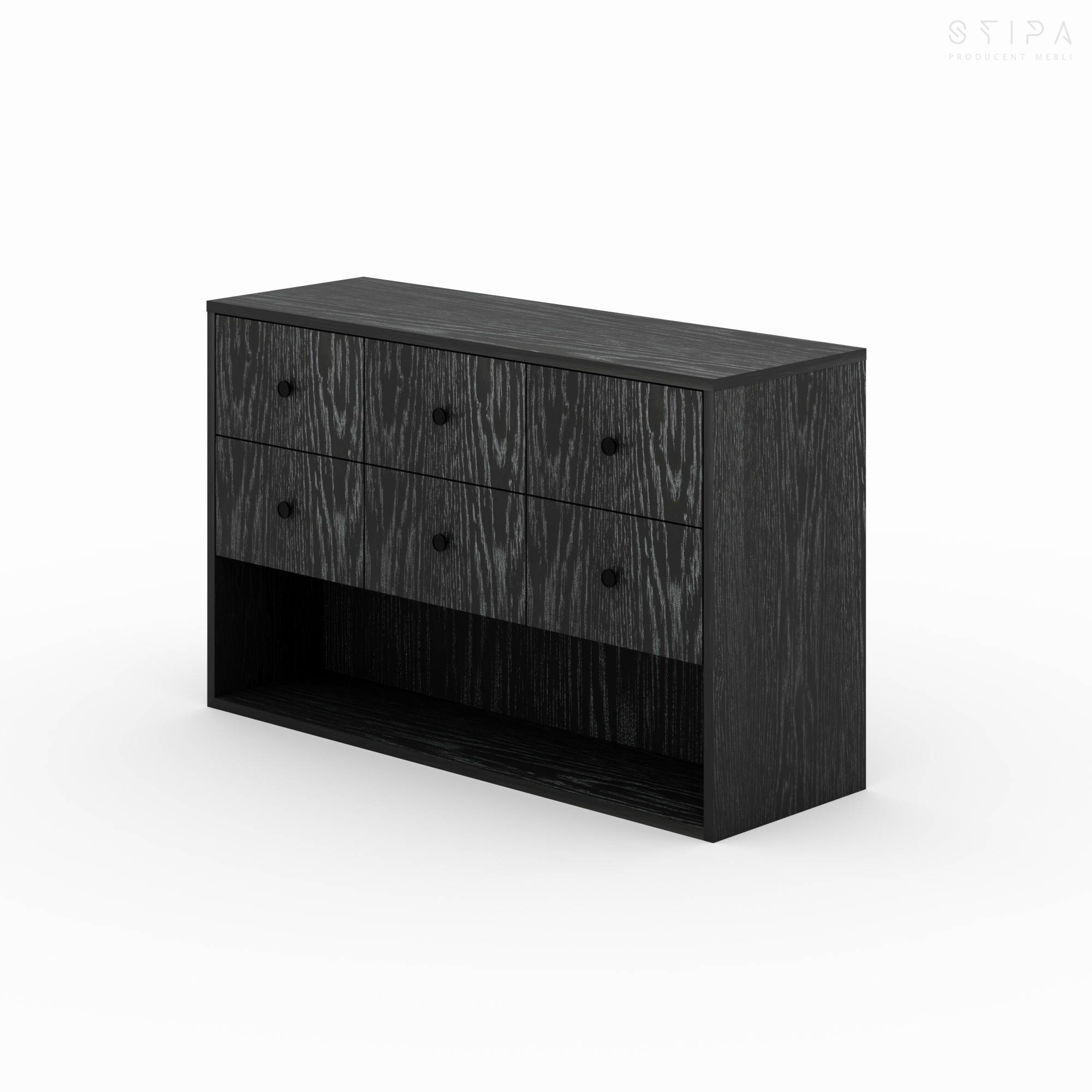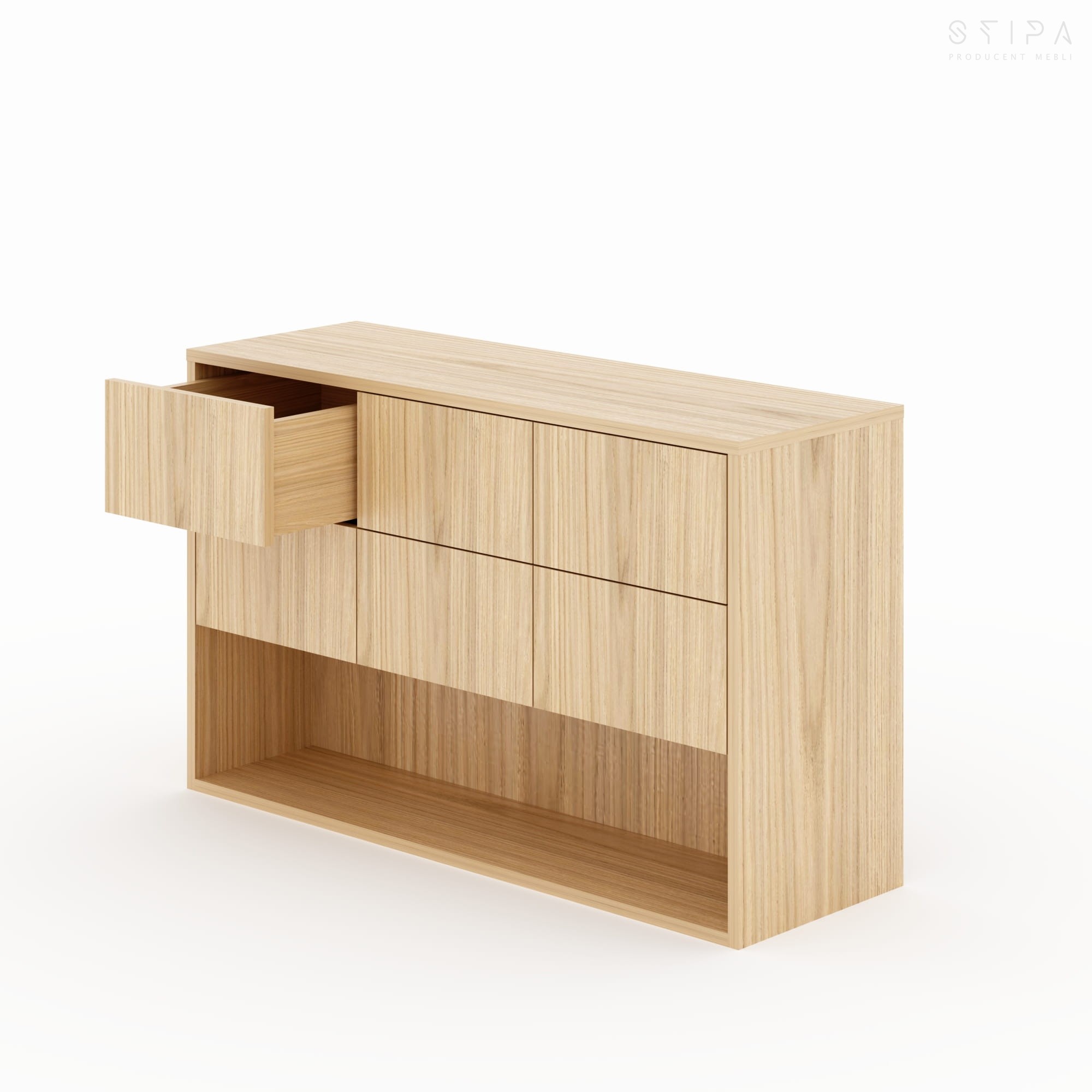 FUCHSIA is an elegant chest of drawers with a modern, architectural silhouette that combines minimalist design with everyday functionality. The layout of 6 drawers makes it easy to organize documents, textiles, and accessories, while the open niche at the bottom beautifully displays books, albums, décor, or baskets. Designed for premium interiors, it remains discreet yet distinctive thanks to its generous surfaces and visible wood grain.