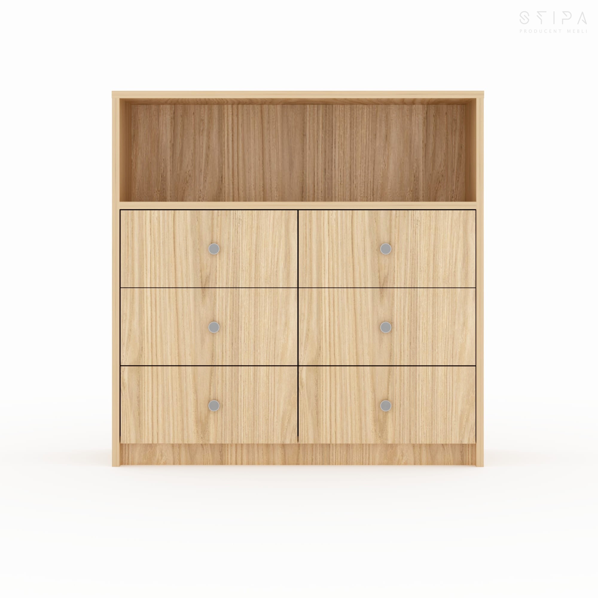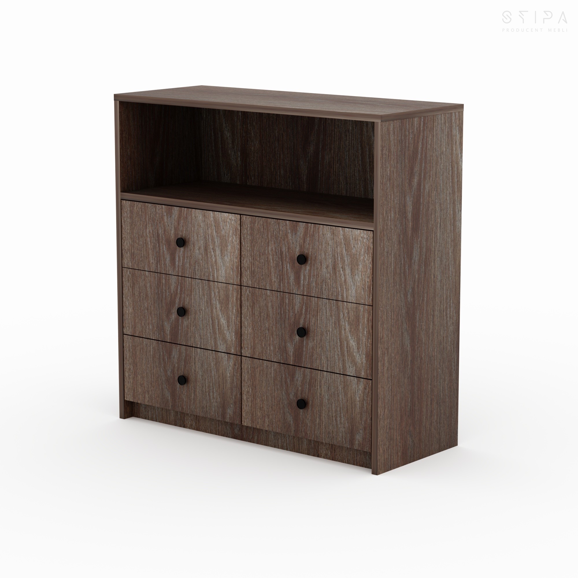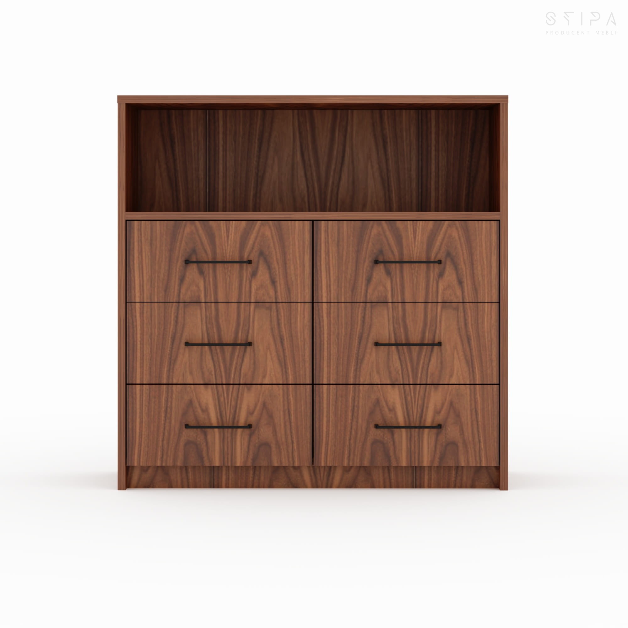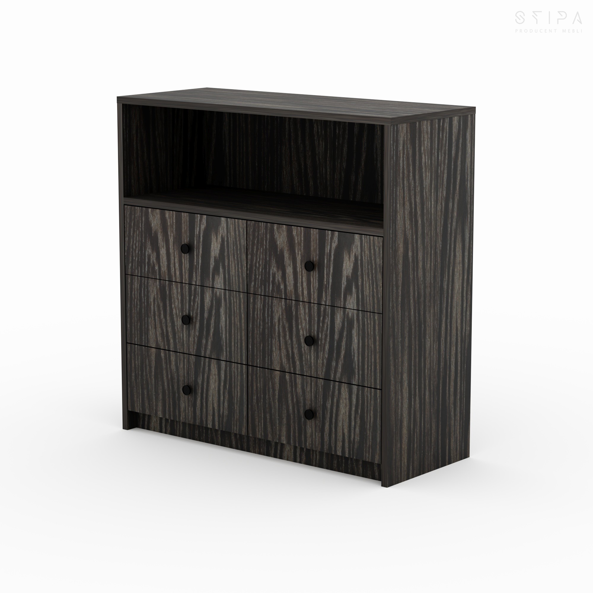 Discover the harmony of form and functionality with the GERBERA piece – a proposal that brings premium quality to every interior. This unique veneered chest of drawers has been designed for those who appreciate stylish design and practical space organization. The furniture construction consists of an upper open segment, perfect for your favorite books, decorations, or A/V equipment, and six spacious drawers that provide excellent storage for small items, clothes, or documents.