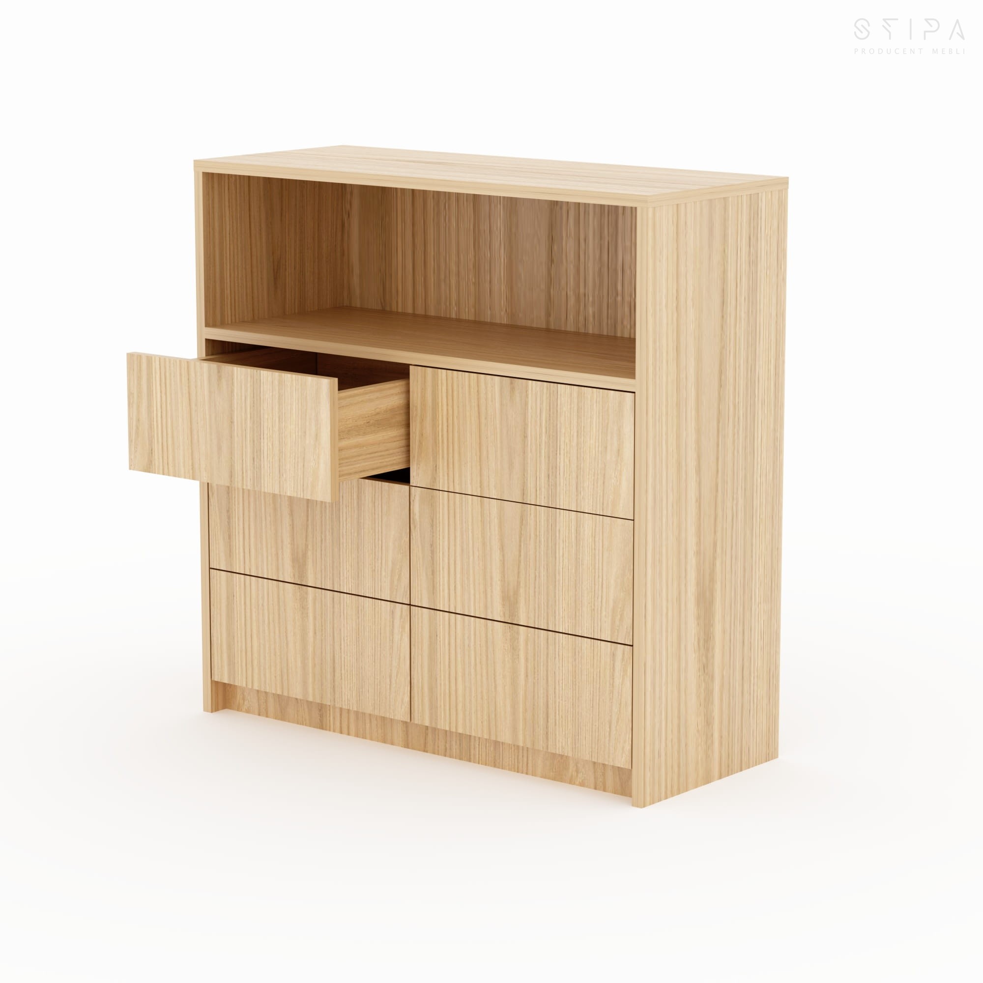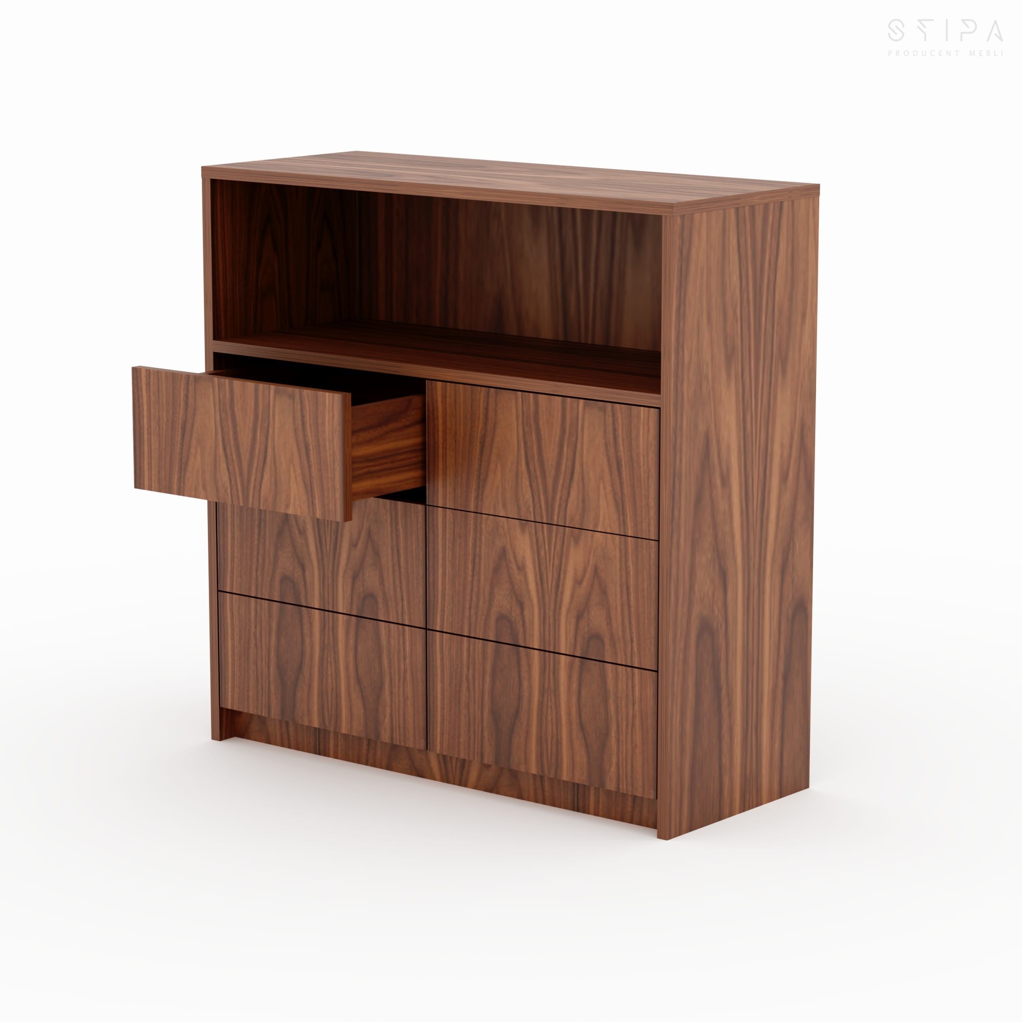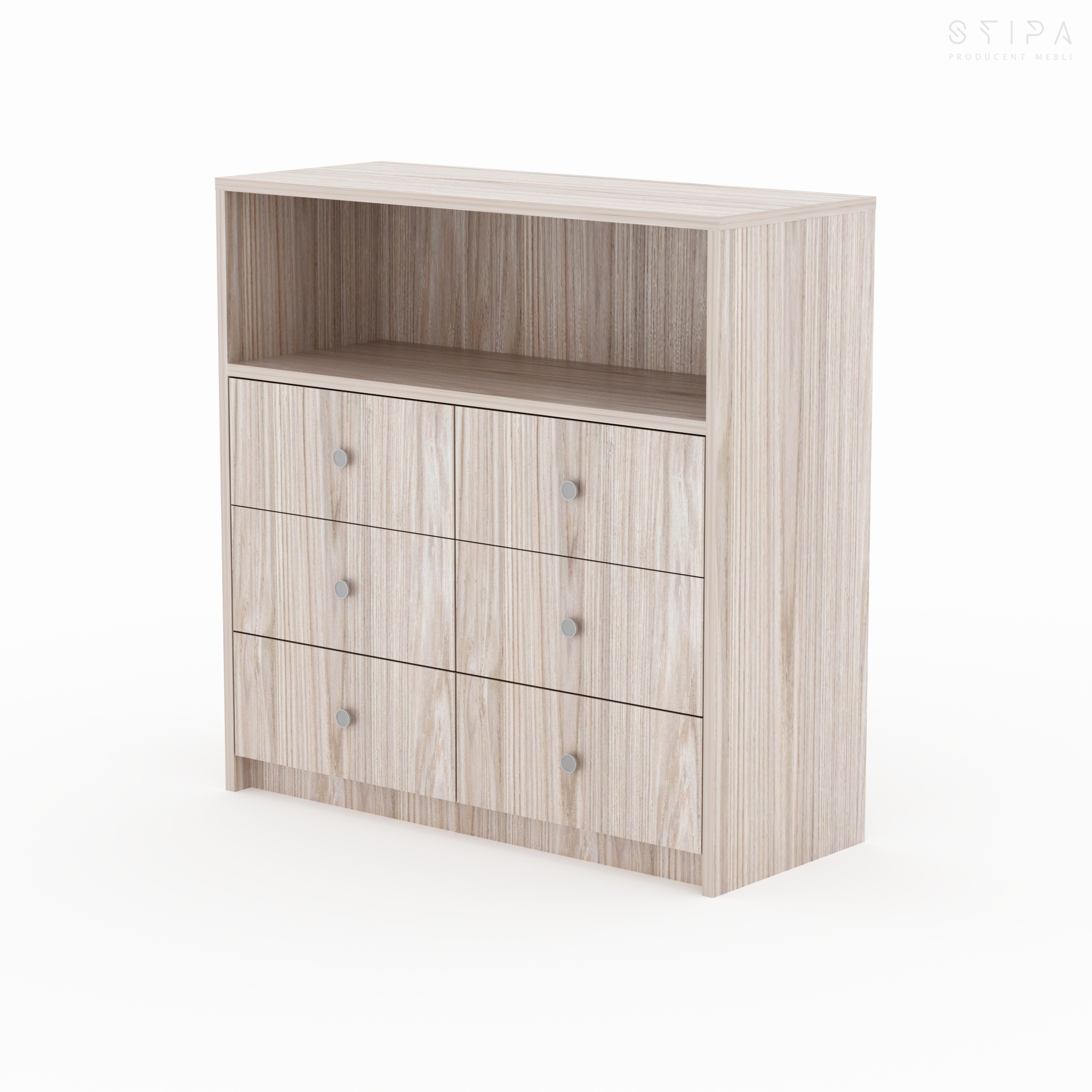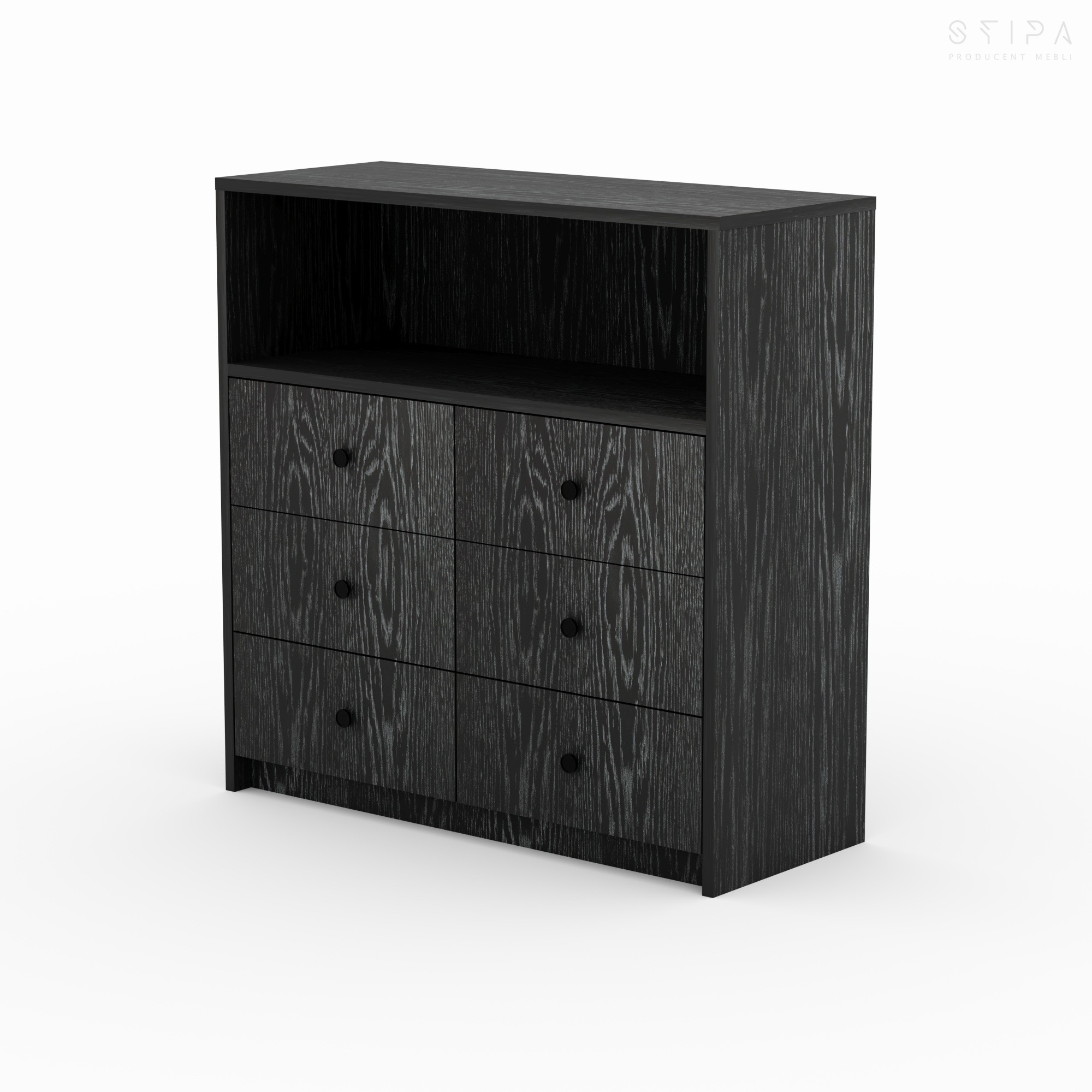 Discover the harmony of form and functionality with the GERBERA piece – a proposal that brings premium quality to every interior. This unique veneered chest of drawers has been designed for those who appreciate stylish design and practical space organization. The furniture construction consists of an upper open segment, perfect for your favorite books, decorations, or A/V equipment, and six spacious drawers that provide excellent storage for small items, clothes, or documents.
