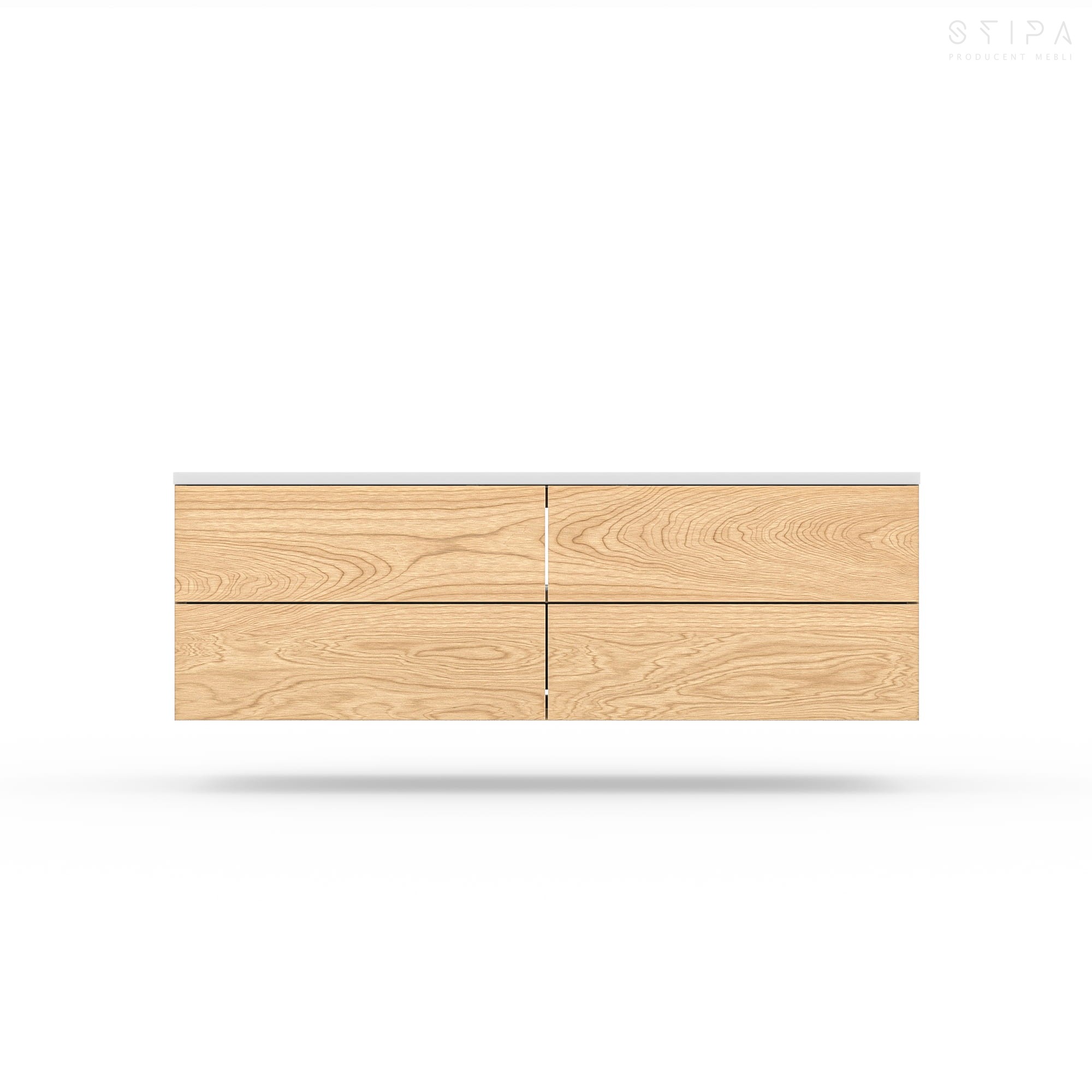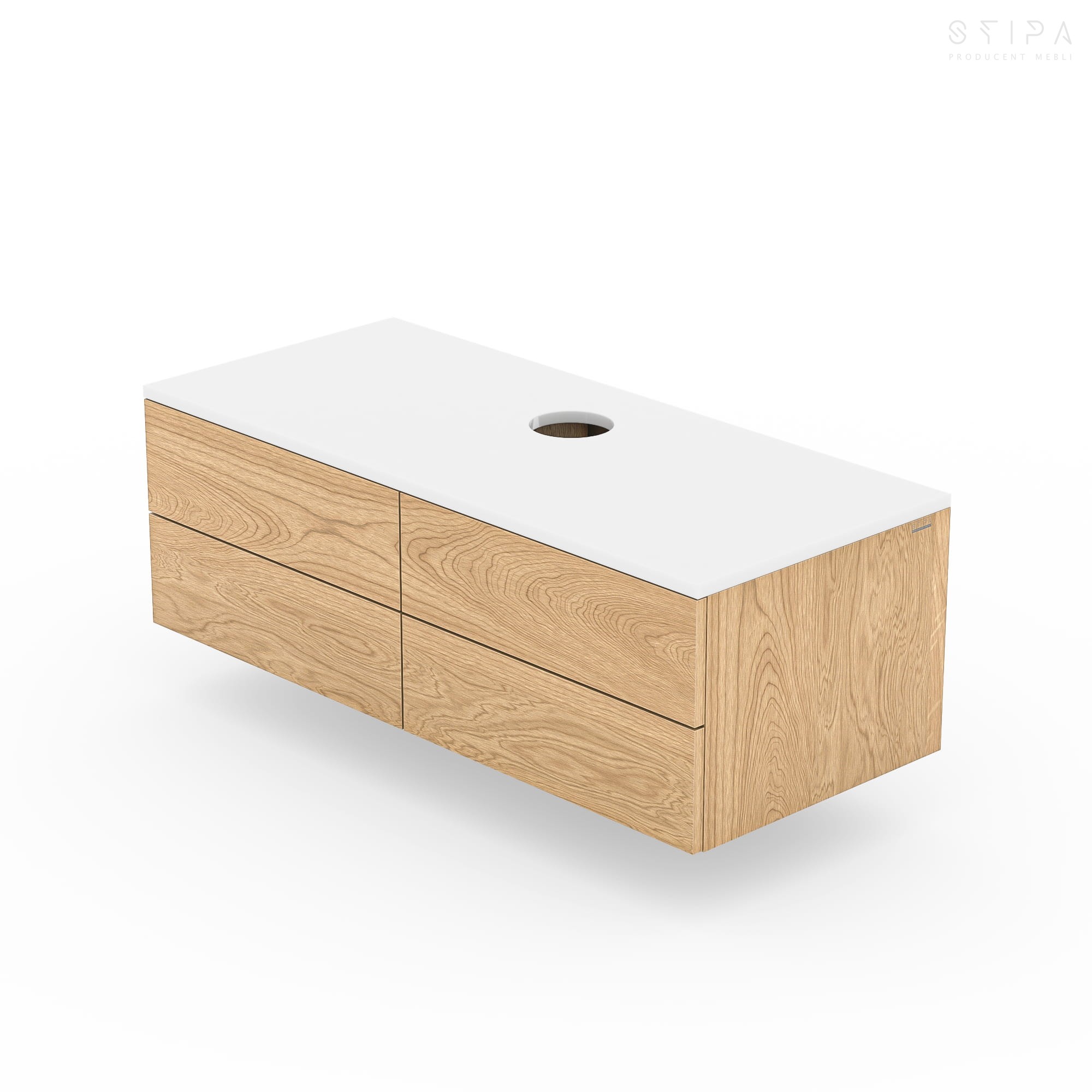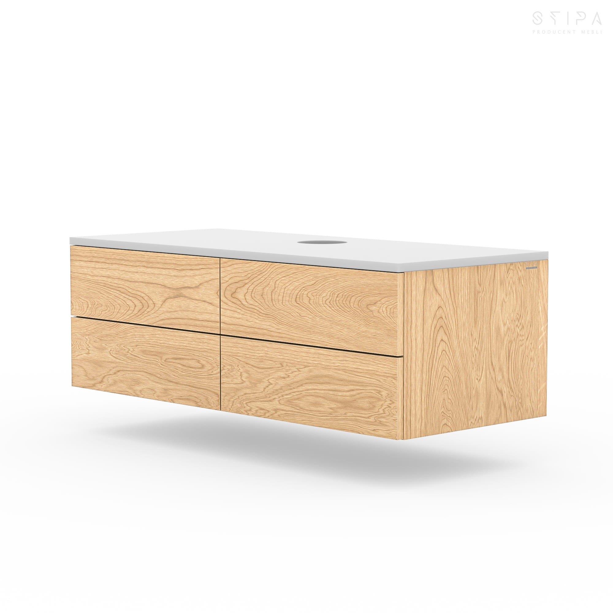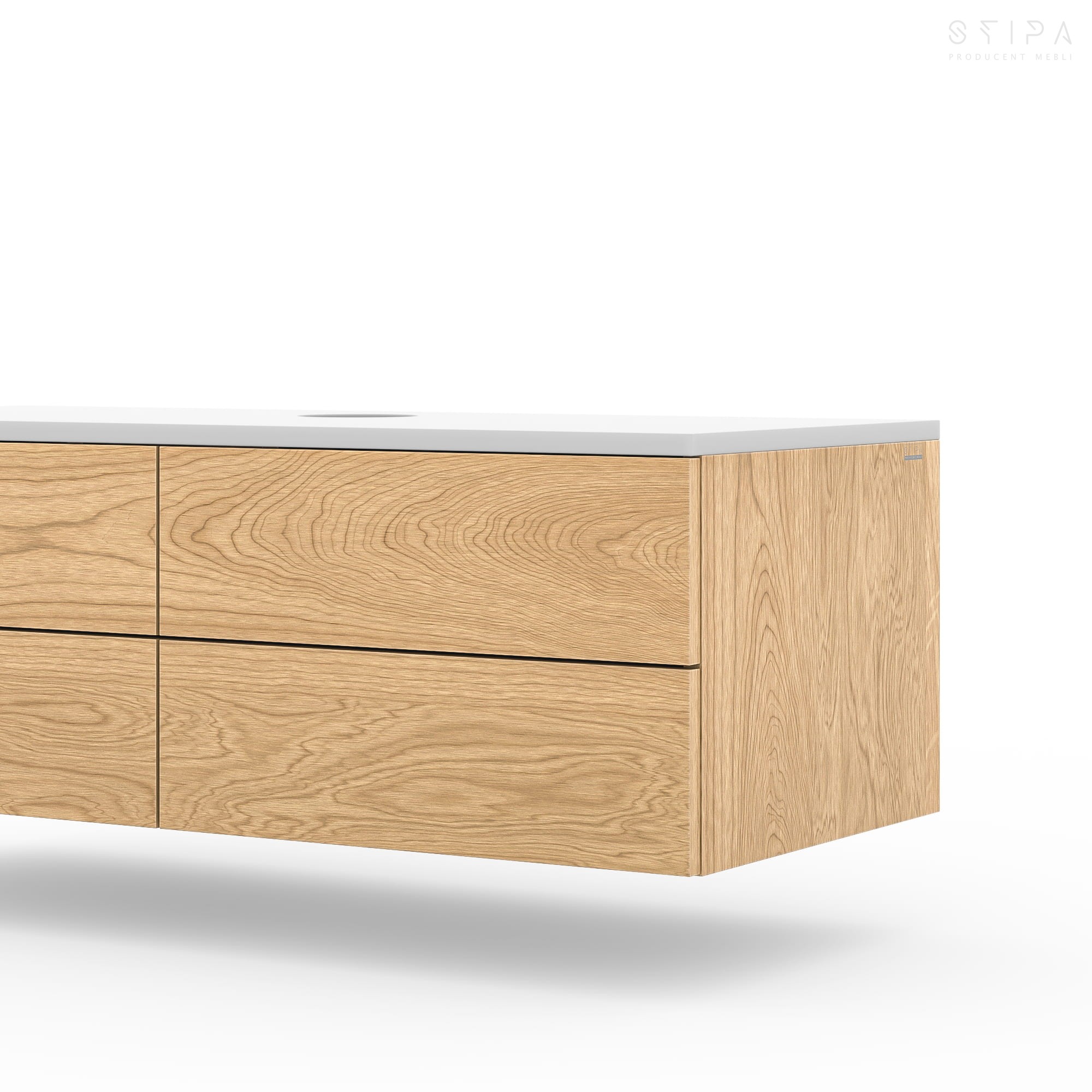 The countertop can be made from matching natural oak veneer or finished in any color from the NCS palette, allowing you to tailor the look to your specific interior style. Each cabinet is made to order, handcrafted in Poland with exceptional attention to detail and artisanal care.