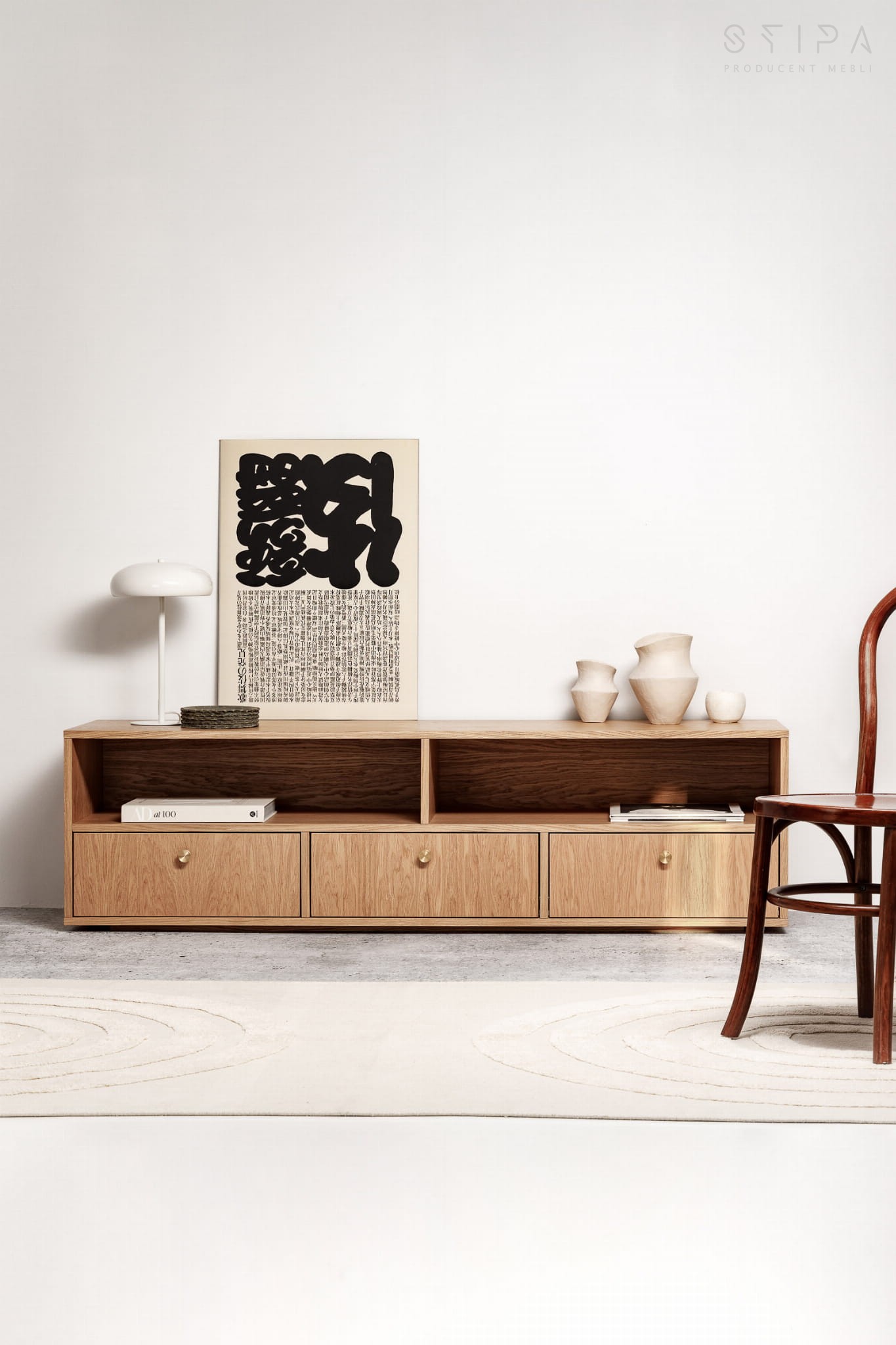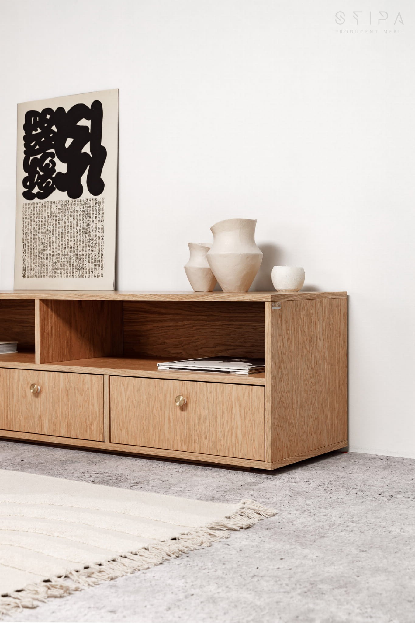 This combination of functionality and style will certainly stand out in any living room. The chest of drawers has 2 shelves and 3 drawers, ideal for storing various types of items. Natural oak veneer gives the furniture a classic look that will complement any existing decor.
