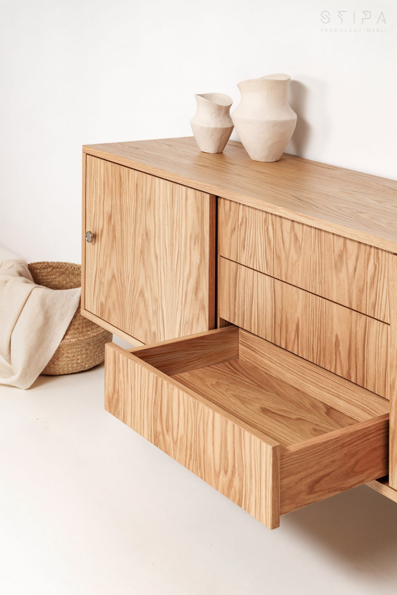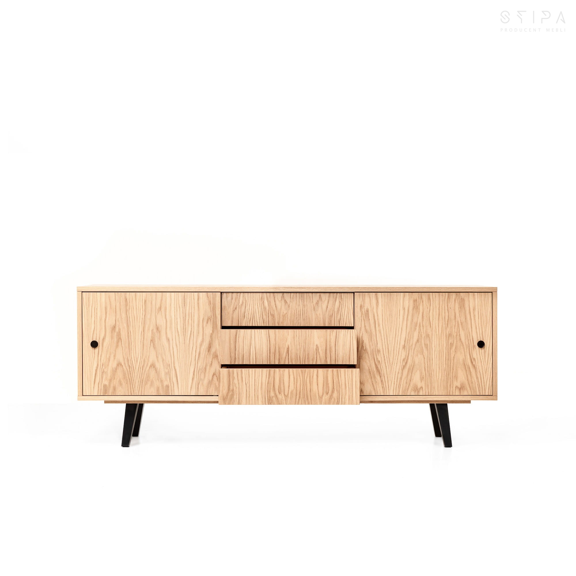 The rectangular shape of the sideboard TV does not visually burden the room, while the sliding doors allow easy access to items inside the cabinet. Behind the sliding door there is a shelf that allows you to put clothes, books or documents inside. The shelves are mounted on spoon supports, thanks to which they do not slide out and create a stable and durable structure. In the central part of the sideboard TV there are three drawers placed on comfortable Blum Movento guides with the "Blumotion" silent closing system. The inside of the drawers is made of natural and very solid veneer.