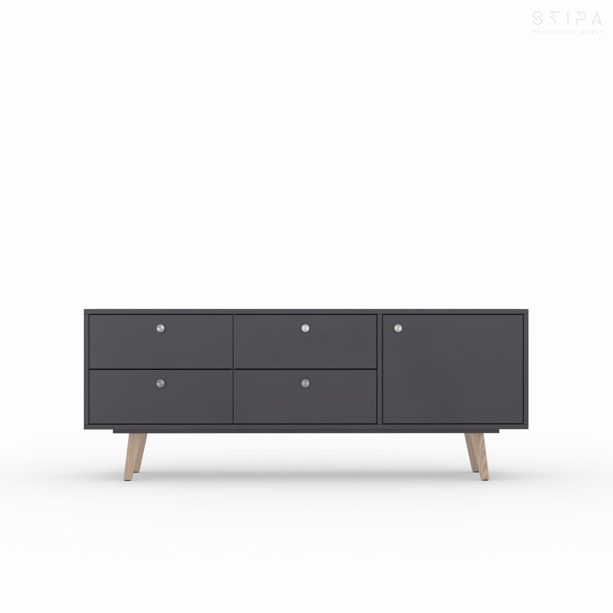 Szafka pod TV VERONICA to eleganckie i funkcjonalne rozwiązanie, które podkreśli charakter każdego salonu, sypialni, biura czy innego pomieszczenia. Drzwiczki otwierane po prawej stronie mebla sprawiają, że dostęp do przechowywanej elektroniki jest łatwy i wygodny. Z lewej strony znajdują się cztery pojemne szuflady, które umożliwiają przechowywanie różnorodnych przedmiotów.